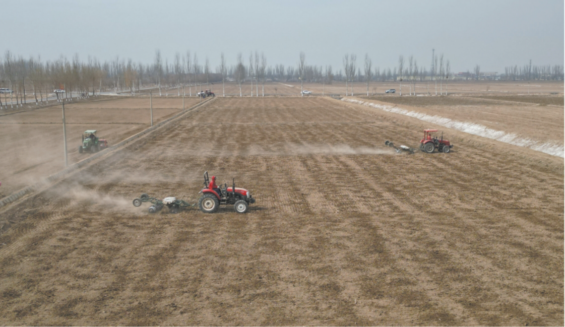 ????現(xiàn)場伴隨著拖拉機的轟鳴聲,耕地機一圈圈耙過農(nóng)田,使土地變得平整蓬松;種肥同播機在田間穿梭,開行、播種、施肥等工序一氣呵成。平羅縣農(nóng)業(yè)技術推廣服務中心工作人員拉尺測量,為試驗示范種植的小麥品種留足生長空間。
